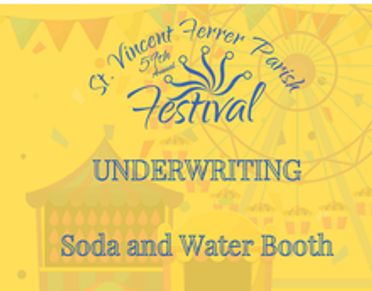 Help support our Parish with an underwriting opportunity for our Soda and Water Booth. Your Family Name will have a 3x6 Banner at the Festival along with recognition on our Social Media Platforms and Church Bulletin.
