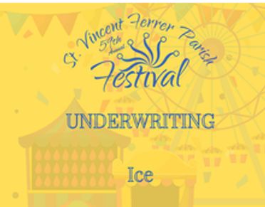 Help support our Parish with an underwriting opportunity for Ice. Your Family Name will have a 3x6 Banner at the Festival along with recognition on our Social Media Platforms and Church Bulletin.