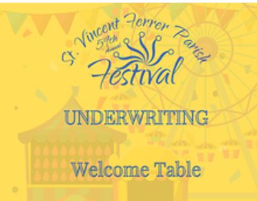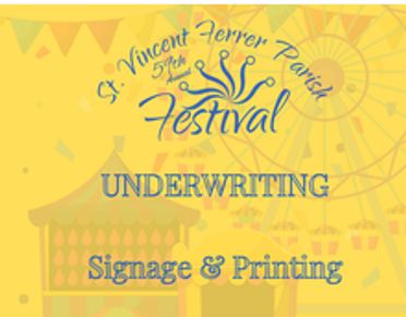 Help support our Parish with an underwriting opportunity for Signage and Printing. Your Family Name will have a Banner at the Festival along with recognition on our Social Media Platforms and Church Bulletin.