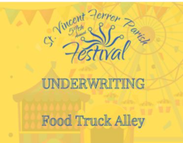 Help support our Parish with an underwriting opportunity for our Food Truck Alley. Your Family Name will have a 3x6 Banner at the Festival along with recognition on our Social Media Platforms and Church Bulletin.
