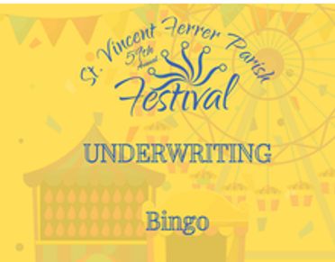 Help support our Parish with an underwriting opportunity for Family Bingo in Kellaghan Hall. Your Family Name will have a 3x6 Banner at the Festival along with recognition on our Social Media Platforms and Church Bulletin.